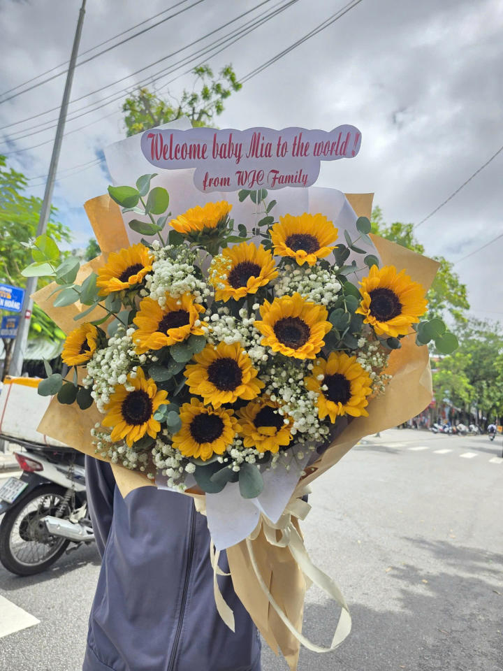 Bó hoa gồm nhiều bông hướng dương vàng tươi, cánh hoa xòe rộng, hướng về phía ánh sáng – tượng trưng cho người thầy, người cô luôn soi đường, dẫn lối cho học trò. Xen giữa các bông hoa là hoa baby trắng nhỏ nhắn, mang lại cảm giác nhẹ nhàng, tinh khiết và làm nổi bật sắc vàng chủ đạo.