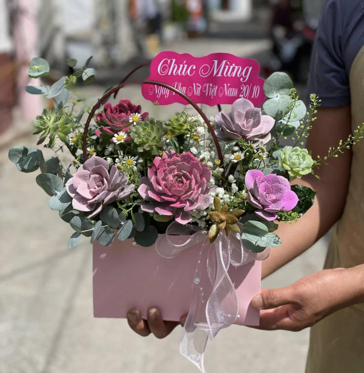 Giỏ hoa sen đá trong ảnh mang phong cách dịu dàng, tinh tế và rất nữ tính, phù hợp để làm quà tặng hoặc trưng bày trong không gian nhỏ như bàn làm việc, kệ sách, quầy lễ tân. Tổng thể giỏ được phối theo tone hồng phấn – tím khói – xanh xám, tạo cảm giác nhẹ nhàng nhưng vẫn nổi bật. Các bông sen đá dáng hoa hồng được chọn kỹ, nở xoè đều, cánh xếp lớp rõ ràng, mang vẻ đẹp sang trọng và bền lâu. Xen kẽ giữa các cụm sen đá là những bông hoa baby trắng và cúc tana nhỏ giúp giỏ hoa trở nên mềm mại, trong trẻo, tạo hiệu ứng như một khu vườn mini. Phần lá phụ sử dụng bạch đàn xanh xám làm nền, giúp màu hoa nổi bật hơn và tổng thể trông thoáng, không bị nặng. Giỏ được thiết kế dạng hộp quai xách màu hồng pastel, kết hợp nơ voan trắng rũ nhẹ tạo cảm giác thanh lịch, hiện đại. Đây là mẫu giỏ sen đá vừa đẹp mắt, vừa ý nghĩa, mang thông điệp yêu thương nhẹ nhàng và bền bỉ theo thời gian.