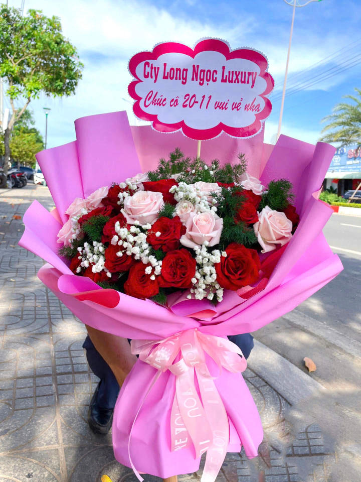 Bó hoa được thiết kế dáng tròn lớn, phối hợp hài hòa giữa hoa hồng đỏ rực rỡ và hoa hồng phấn dịu dàng, tạo nên tổng thể vừa trang trọng vừa ấm áp. Điểm xuyết hoa baby trắng và lá xanh tươi, giúp bó hoa thêm mềm mại, cân đối và tinh tế.
