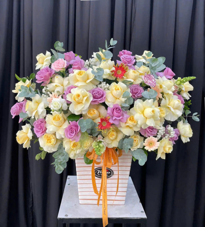 Tổng thể nổi bật với tông vàng kem và tím pastel dịu mắt, kết hợp hài hòa giữa hoa hồng kem, hồng tím, điểm xuyết hoa đồng tiền, baby trắng và lá bạch đàn xanh xám, tạo cảm giác mềm mại nhưng vẫn rất sang trọng. Hoa được cắm dáng vòm ngang, xếp lớp tự nhiên, dày dặn và cân đối.