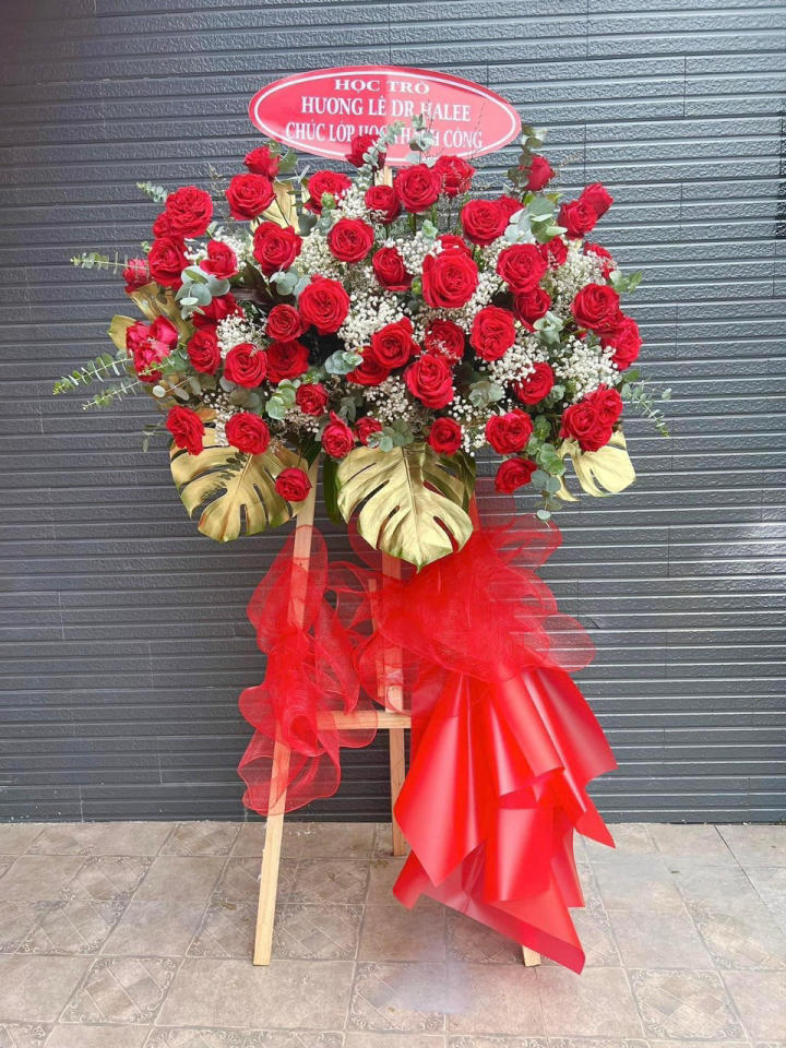 Kệ chúc mừng dáng giá gỗ ba chân, phối đỏ – trắng – vàng kim nổi bật.