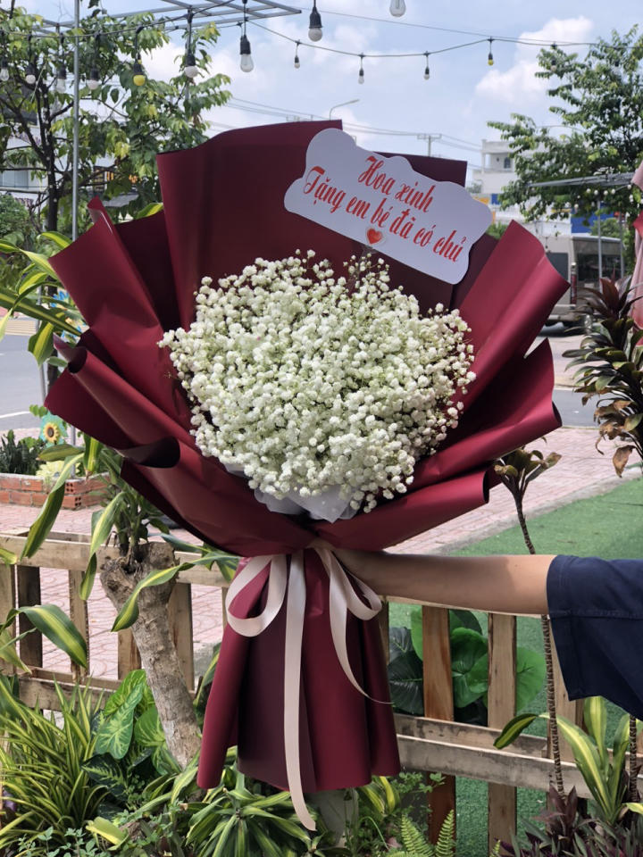 Bó hoa được thiết kế dáng tròn đầy với hoa baby trắng cắm dày, tượng trưng cho tình yêu trong sáng, chân thành và bền lâu. Toàn bộ bó hoa nổi bật trên nền giấy gói đỏ rượu vang sang trọng, tạo sự tương phản tinh tế giữa nét mềm mại và vẻ quý phái.