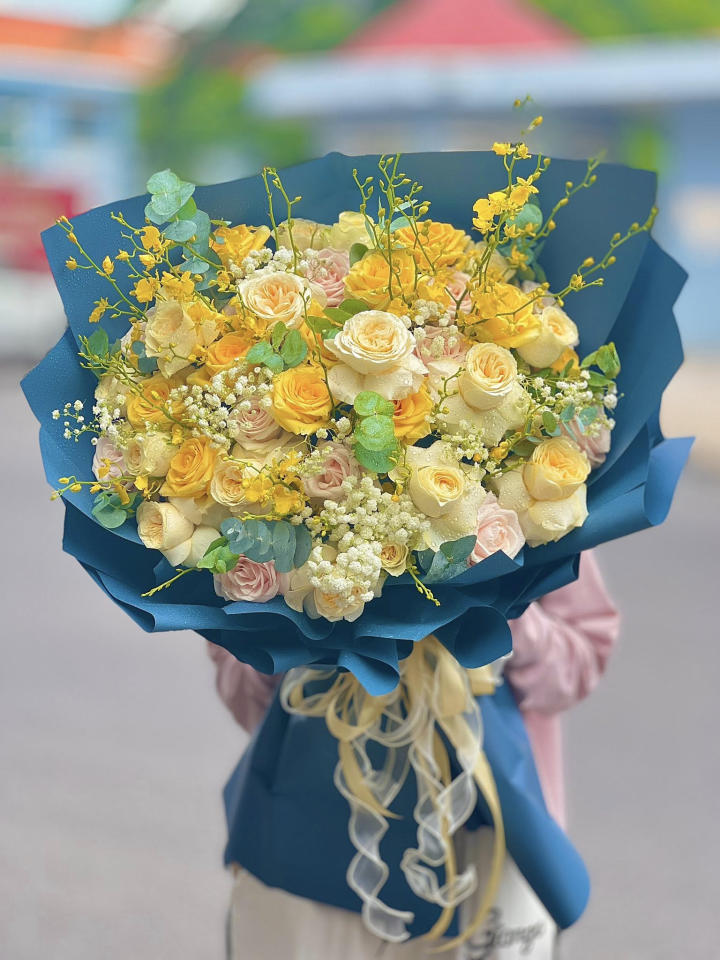 Bó hoa trong ảnh mang vẻ đẹp tươi sáng, thanh lịch và đầy năng lượng tích cực, rất phù hợp làm quà tặng trong dịp Ngày của Cha. Tông màu chủ đạo là vàng – kem – xanh dương, tạo nên sự kết hợp hài hòa giữa nét ấm áp và sự vững chãi. Những bông hoa hồng vàng và hồng kem được sắp xếp dày dặn, nở đều, tượng trưng cho sự trân trọng, thành công và lời chúc tốt đẹp.