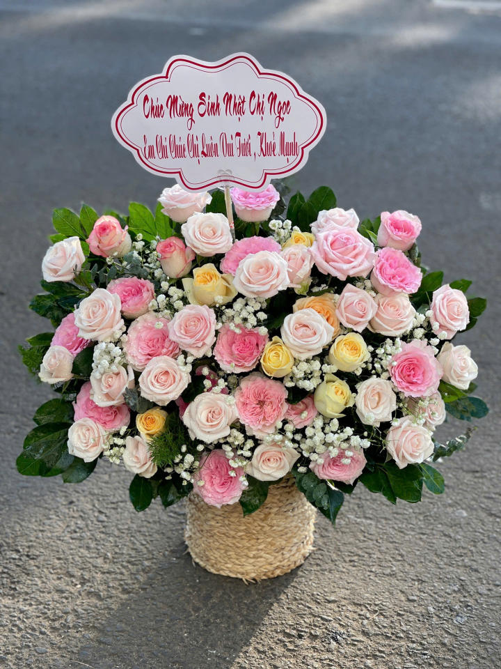 Kèm bảng chúc mừng cá nhân hóa, giúp giỏ hoa thêm ý nghĩa và trang trọng.