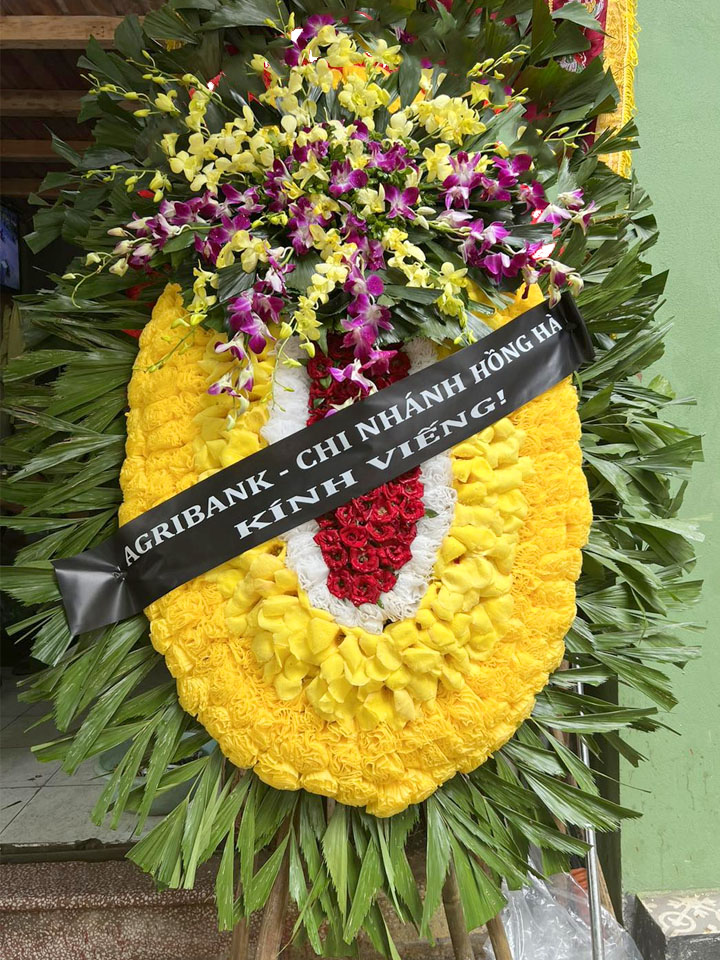 Vòng hoa có dáng bầu dục đứng, đây là kiểu dáng phổ biến trong tang lễ Việt Nam, tượng trưng cho vòng luân hồi sinh tử và lời cầu nguyện vĩnh an.