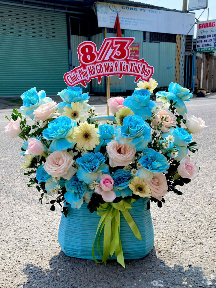 Xen kẽ là hoa baby trắng giúp tổng thể mềm mại, tạo hiệu ứng bồng bềnh như một đám mây nhẹ bao quanh sắc vàng trung tâm. Thiết kế giỏ hoa dáng tròn lớn, cắm đầy đặn và cân đối, mang lại cảm giác vững chãi và bền bỉ. Phần hộp ánh kim vàng kết hợp cùng nơ vàng nhạt càng làm tăng vẻ cao cấp, phù hợp với những dịp trang trọng. Tổng thể giỏ hoa gửi gắm thông điệp về sự thành đạt, bền vững và giá trị lâu dài, là món quà ý nghĩa để thể hiện sự kính trọng và biết ơn.