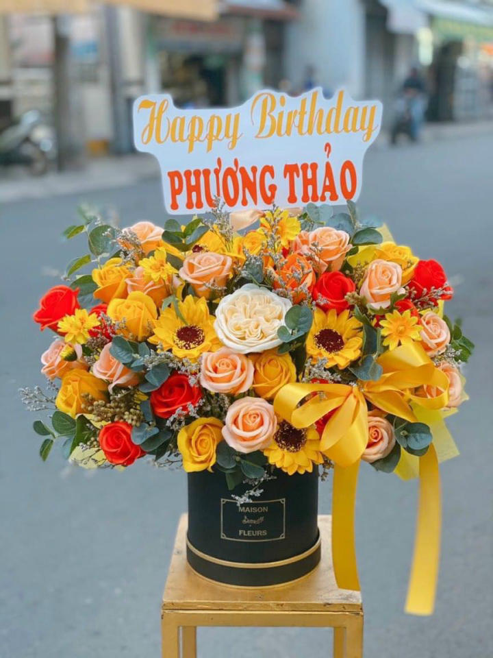 Hoa được cắm trong hộp trụ màu đen cao cấp, điểm chữ vàng sang trọng, phía trước thắt nơ ruy băng vàng nổi bật, tạo điểm nhấn tinh tế và hiện đại. Phía trên giỏ hoa gắn bảng chúc mừng sinh nhật, giúp món quà thêm ý nghĩa và cá nhân hóa theo người nhận.