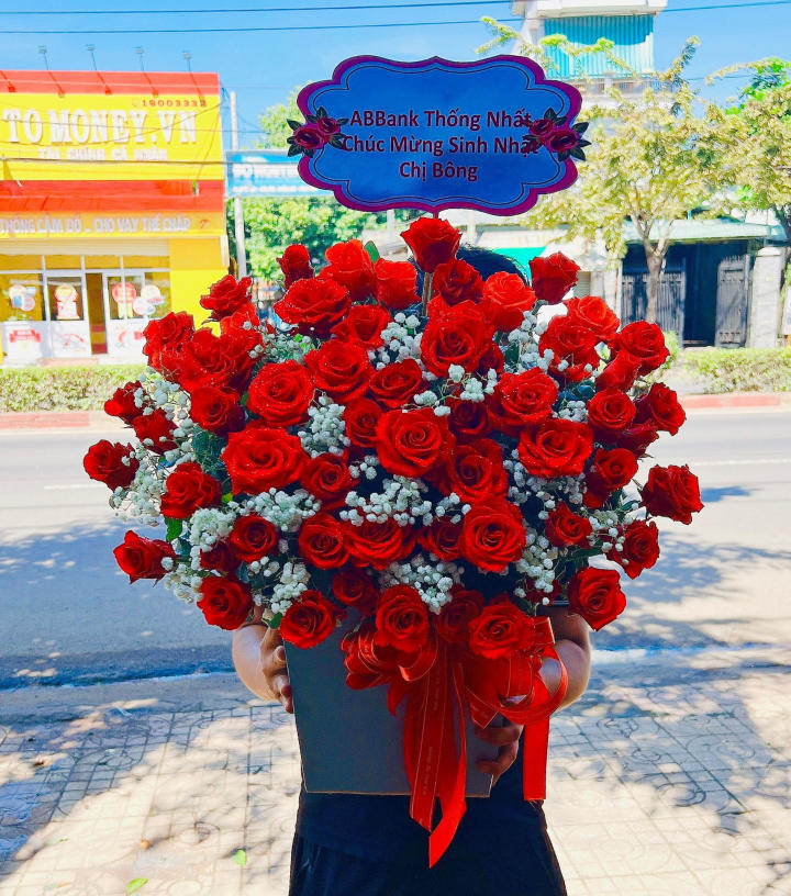 Giỏ hoa được kết từ hoa hồng đỏ rực cắm dày, nở đều và đồng bộ, xen kẽ hoa baby trắng nhỏ xinh, tạo điểm nhấn tinh tế và giúp tổng thể thêm phần mềm mại. Bố cục hoa tròn đầy, cao và chắc tay, mang lại cảm giác rất ấn tượng ngay từ cái nhìn đầu tiên.