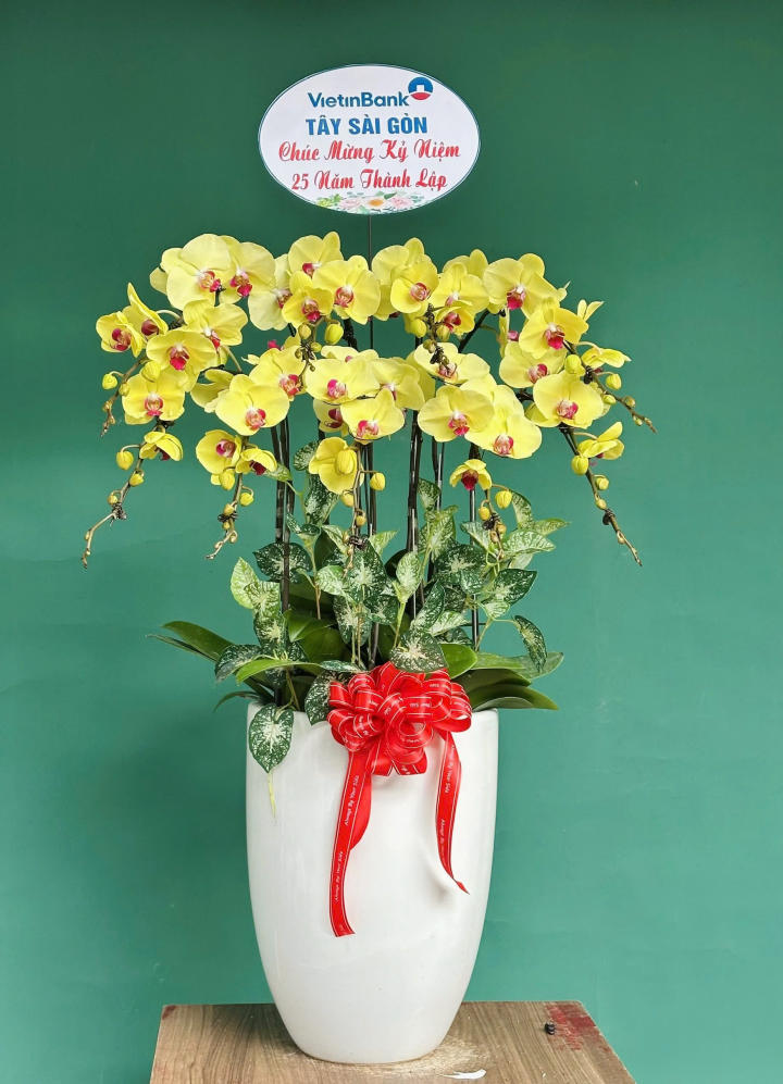 Chậu được trồng trong chậu sứ trắng cao cấp, kết hợp cùng lá phụ xanh mát và nơ đỏ nổi bật, tạo nên tổng thể hài hòa và tinh tế. Đây là mẫu chậu lan rất thích hợp để tặng khai trương, kỷ niệm thành lập, chúc mừng thành công hoặc trang trí không gian sang trọng.