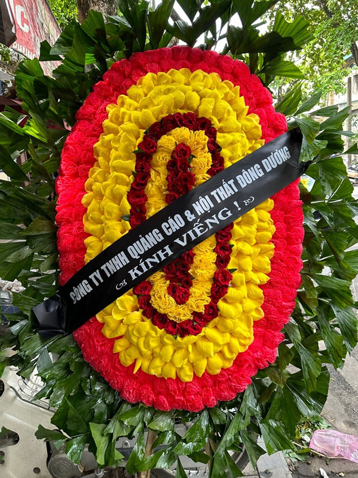 Vòng hoa được chia thành nhiều lớp đồng tâm, với các gam màu truyền thống mang ý nghĩa sâu sắc: