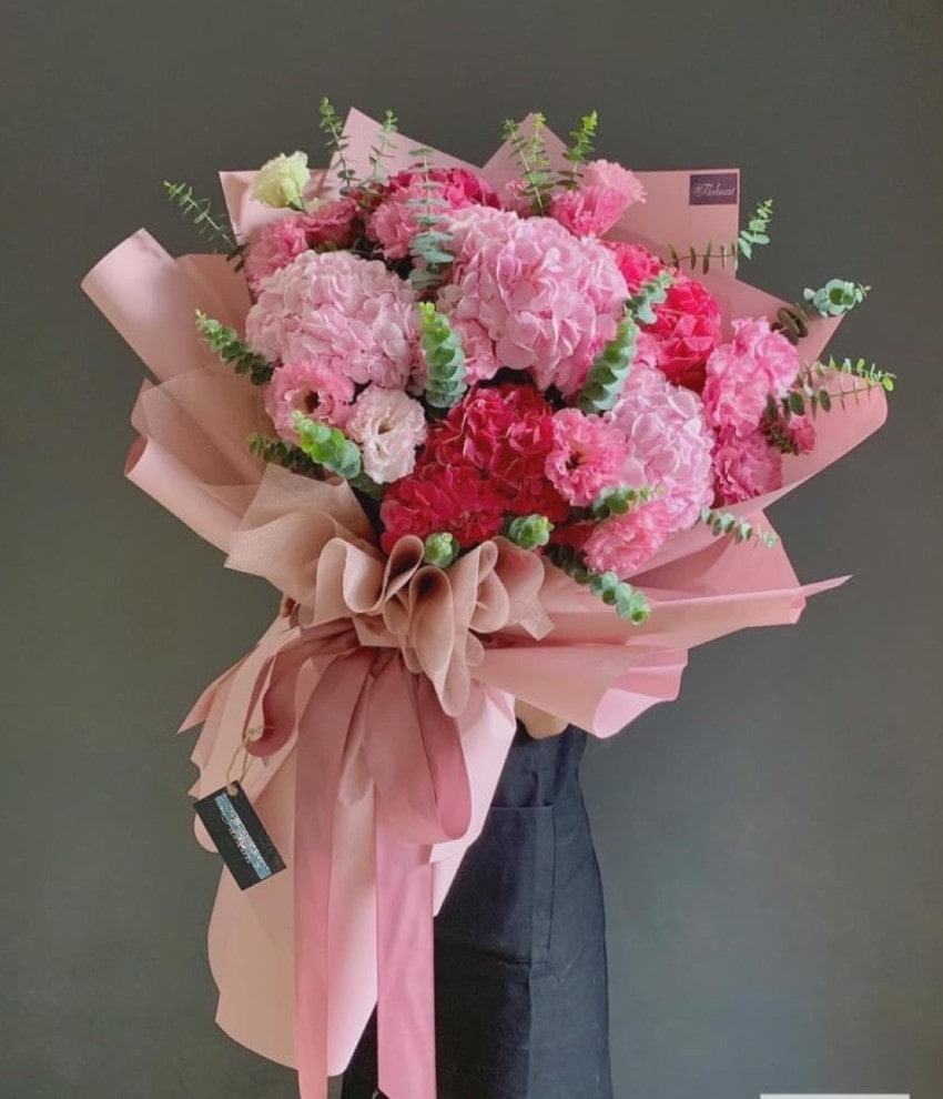 Bó hoa được tạo nên từ những bông cẩm tú cầu to tròn, có sắc hồng phấn xen kẽ hồng đậm, kết hợp cùng hoa hồng nhỏ và lá bạc hà xanh mướt giúp tổng thể trở nên hài hòa, tự nhiên và có chiều sâu. Sự chuyển sắc từ nhạt đến đậm tạo nên hiệu ứng nổi bật, thu hút ánh nhìn.