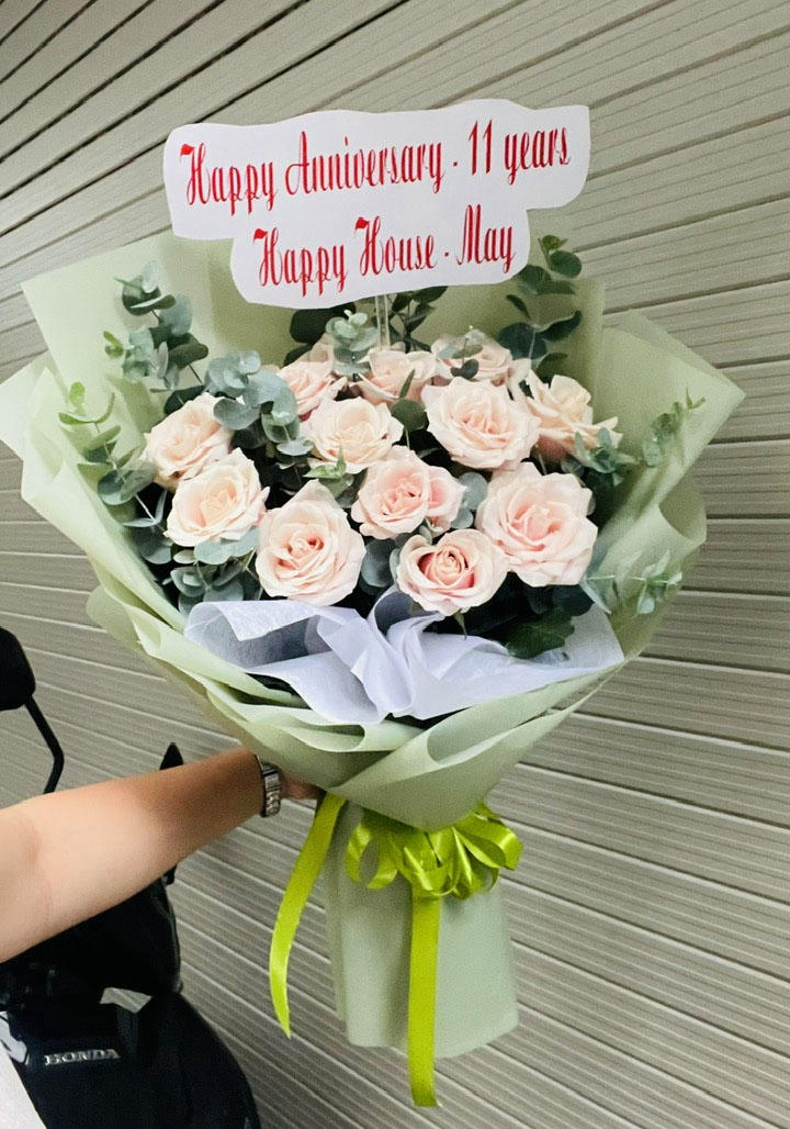 Hoa chính: những bông hồng phấn nhạt – biểu tượng của sự ngọt ngào, tôn kính và lòng biết ơn chân thành.