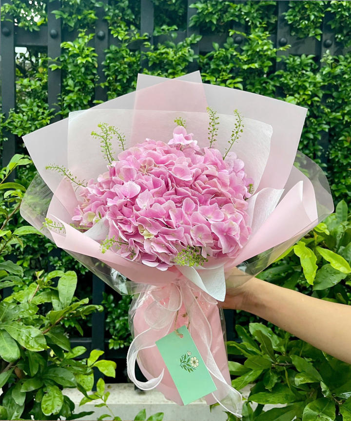 Hoa cẩm tú cầu hồng tượng trưng cho tình yêu chân thành, sự biết ơn và niềm vui trọn vẹn. Bó hoa được thiết kế đơn giản nhưng tinh tế, chỉ gồm một bông cẩm tú cầu lớn làm điểm nhấn, điểm xuyết bởi vài nhánh lá xanh nhỏ và cành hoa li ti để tạo độ mềm mại và tự nhiên.