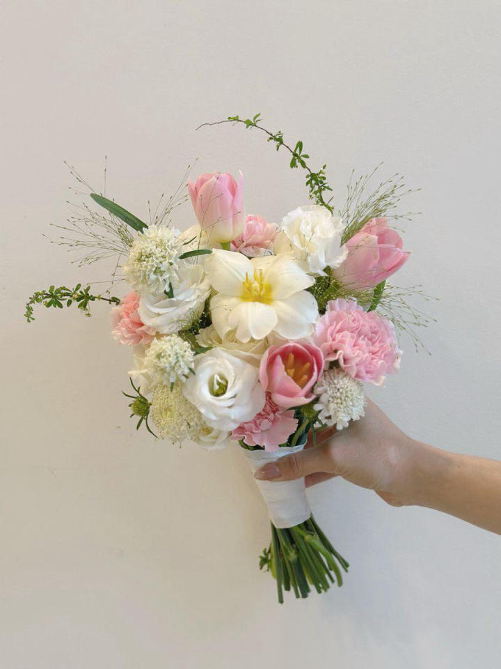Bó hoa là sự kết hợp hài hòa giữa hoa tulip hồng phấn, hoa lisianthus trắng, cẩm chướng hồng nhạt và điểm nhấn nổi bật ở trung tâm là hoa trắng lớn nở xòe (tạo cảm giác như ánh nắng dịu). Xen kẽ là các loại hoa bi trắng và cỏ, lá mảnh xanh non vươn nhẹ, tạo tổng thể rất mềm mại và sống động.