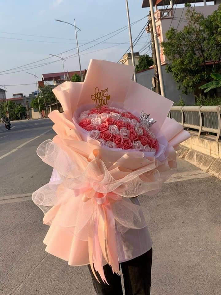 Phần ngoài được bọc giấy hồng phấn nhiều lớp, xếp nếp rộng và thoáng, kết hợp nơ voan lớn cùng ruy băng dài, làm tổng thể trở nên bay bổng và nhẹ nhàng. Bó hoa còn được điểm xuyết chi tiết trang trí nhỏ phía trên, tăng thêm vẻ sang trọng.