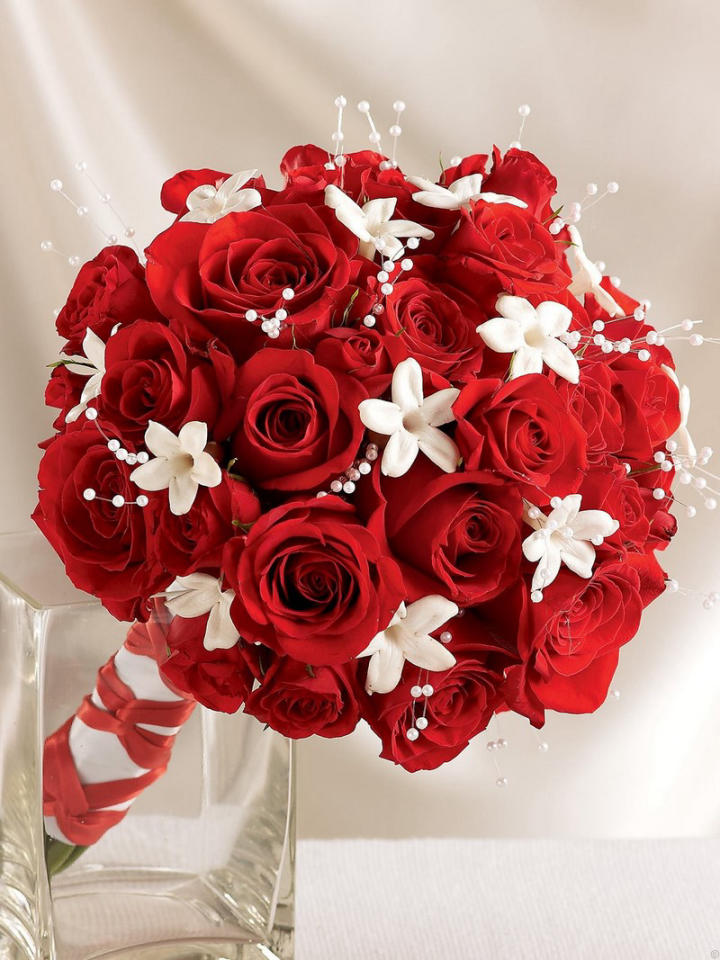 Bó hoa được kết theo form tròn cổ điển, cắm dày và cực kỳ đều tay. Hoa chủ đạo là hoa hồng đỏ nhung nở lớn, cánh dày, màu đỏ sâu tạo cảm giác nổi bật và sang trọng. Xen kẽ giữa các bông hồng là những bông hoa trắng nhỏ (dạng hoa sao) giúp tổng thể có điểm sáng, làm bó hoa không bị nặng màu mà vẫn giữ được vẻ tinh tế. Ngoài ra còn có các chi tiết hạt ngọc trắng đính xen kẽ, tạo hiệu ứng lấp lánh như trang sức, khiến bó hoa trông cao cấp và rất hợp phong cách cô dâu hiện đại. Phần tay cầm được quấn gọn bằng ruy băng đỏ trắng, tổng thể vừa nổi bật vừa lãng mạn. Mẫu này cực hợp làm hoa cưới, hoa cầu hôn, hoặc tặng dịp kỷ niệm quan trọng.