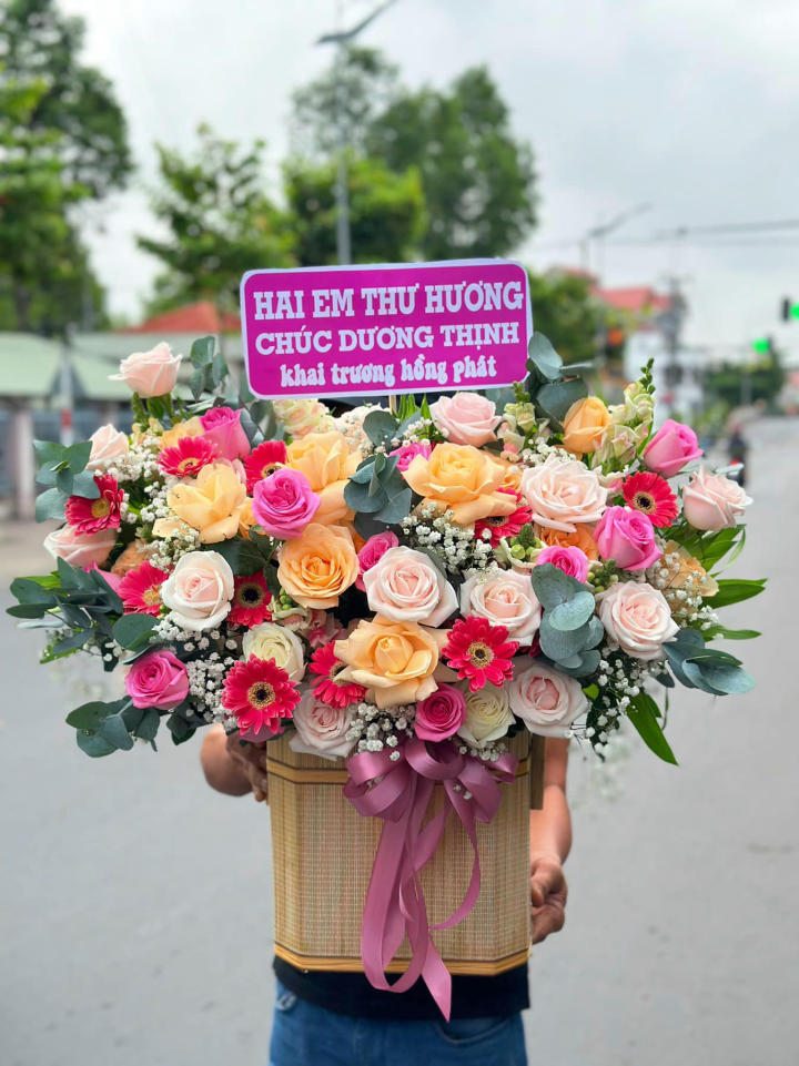 Giỏ hoa nổi bật với gam màu pastel ngọt ngào, kết hợp tinh tế giữa hồng phấn, hồng đậm, cam đào và vàng kem. Những đóa hồng tươi được đan xen cùng hoa đồng tiền rực rỡ, baby trắng và lá bạc eucalyptus tạo nên tổng thể mềm mại nhưng vẫn đầy sức sống. Kiểu cắm tròn, đầy đặn, phối màu hài hòa mang đến cảm giác tươi vui, trẻ trung và tràn đầy năng lượng tích cực. Phần giỏ hộp vuông chắc chắn, điểm thêm nơ lụa hồng sang trọng, rất phù hợp làm quà tặng 8/3 dành cho mẹ, người yêu, vợ hoặc đồng nghiệp nữ.