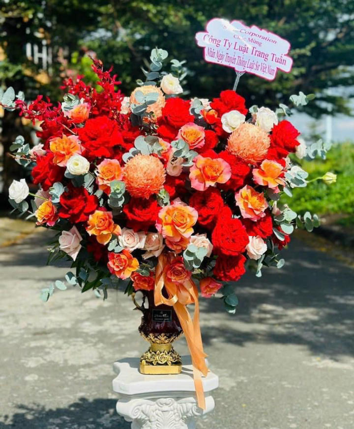 Phần chân là chậu đứng dáng cổ điển, họa tiết sang trọng, kết hợp nơ lụa cam mềm mại buông nhẹ, làm tăng thêm vẻ quý phái và nổi bật. Chậu hoa toát lên khí chất thịnh vượng, trang trọng và đầy sức hút, rất phù hợp làm quà tặng trong các dịp chúc mừng, khai trương hoặc sự kiện quan trọng.