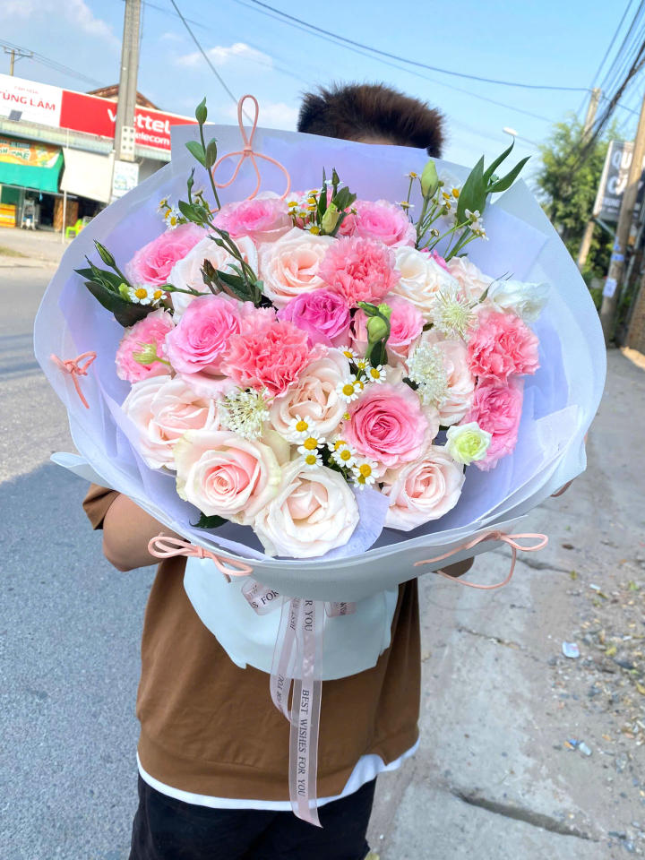 Bó hoa trong ảnh mang vẻ đẹp dịu dàng, thanh thoát và đầy tinh tế, rất phù hợp để dành tặng mẹ trong ngày 10/5. Tông màu chủ đạo là hồng pastel – kem – trắng – xanh nhẹ, tạo nên cảm giác nhẹ nhàng và ấm áp. Những bông hoa hồng hồng phấn và hồng kem nở mềm mại, tượng trưng cho tình yêu thương dịu dàng và sự biết ơn chân thành dành cho mẹ. Xen kẽ là hoa cẩm chướng hồng – loài hoa đặc trưng cho tình mẫu tử, cùng với cúc tana và hoa baby trắng, giúp tổng thể thêm phần tươi tắn và tự nhiên.