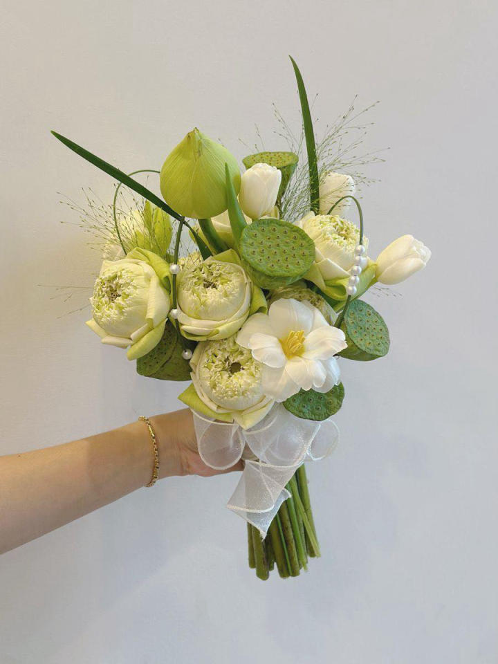 Bó hoa được kết theo dáng tự nhiên, thon dài, tạo cảm giác nhẹ nhàng và nghệ thuật. Hoa chủ đạo là sen trắng gồm nhiều trạng thái: búp sen, bông sen hé nở và những bông sen nở nhẹ, giúp bó hoa có chiều sâu và rất “đắt”. Xen kẽ là đài sen xanh tạo điểm nhấn độc đáo, mang nét mộc mạc nhưng cực kỳ sang trọng. Bó hoa còn được phối thêm hoa trắng nhỏ (dáng tulip/hoa nhánh) giúp tổng thể mềm mại hơn. Một vài nhánh cỏ bay và lá dài được cắm vươn cao tạo độ thoáng, làm bó hoa trông thanh và hiện đại. Tay cầm để lộ thân sen xanh tự nhiên, buộc bằng nơ voan trắng nhẹ nhàng. Tổng thể bó hoa mang vibe thuần khiết – tinh tế – trang nhã, rất hợp làm hoa cưới áo dài, hoa chụp ảnh concept Việt, hoặc tặng dịp trang trọng.
