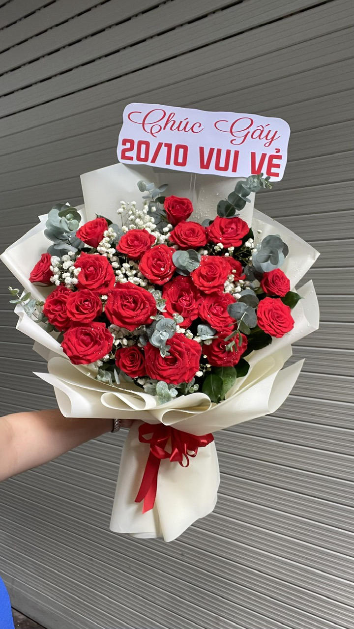 Bó hoa trong ảnh là một bó hoa hồng đỏ rực rỡ, mang vẻ đẹp sang trọng, nồng nàn và tràn đầy cảm xúc, rất phù hợp để dành tặng thầy cô nhân dịp 20/11 – Ngày Nhà giáo Việt Nam.