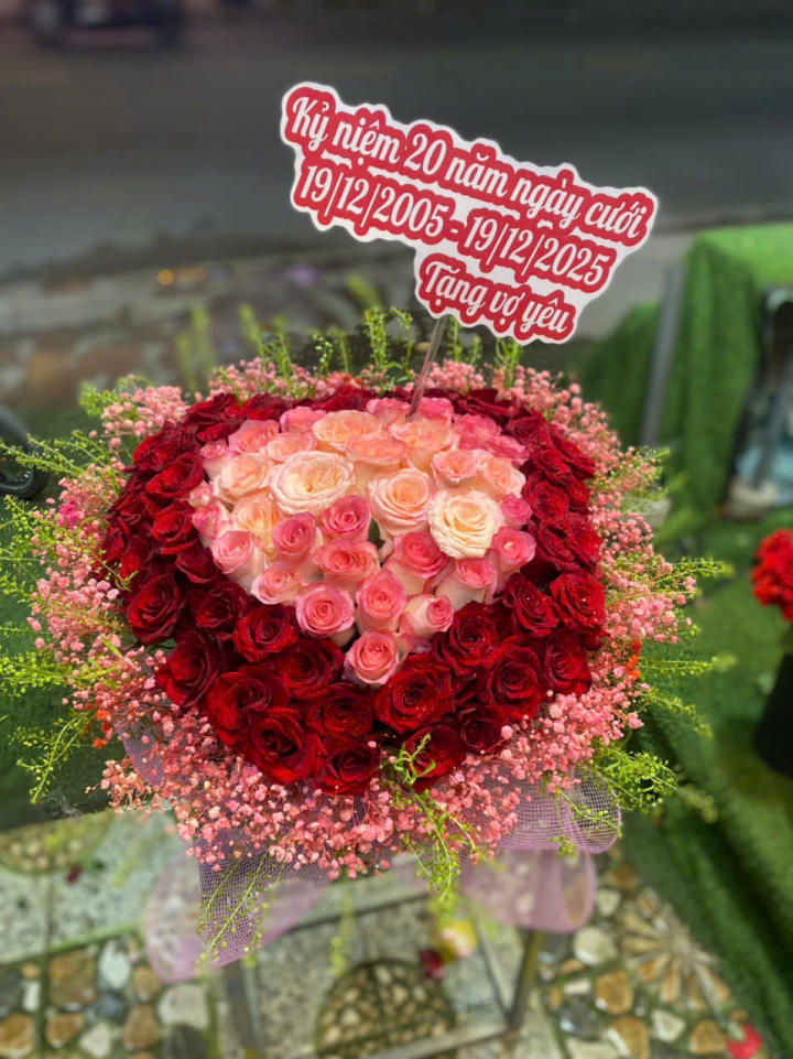 Giỏ hoa được thiết kế hình trái tim đầy đặn, nổi bật và giàu cảm xúc – biểu tượng trọn vẹn của tình yêu.