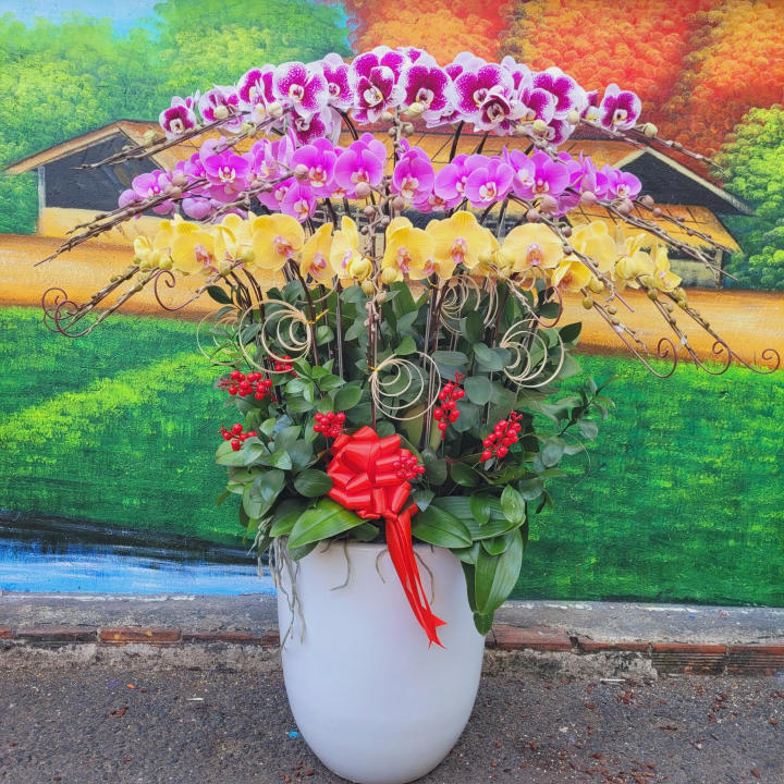 Chậu lan hồ điệp nổi bật với thiết kế nhiều tầng hoa rực rỡ, kết hợp hài hòa giữa các gam màu tím, hồng và vàng tạo nên vẻ đẹp sang trọng, ấn tượng và đầy sức sống. Các cành lan được uốn cong nghệ thuật như chiếc vòm mềm mại, mang đến cảm giác tinh tế và đẳng cấp.