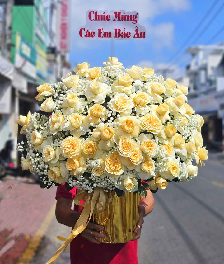 Giỏ hoa trong ảnh mang vẻ đẹp sang trọng, tinh tế và đầy khí chất, rất phù hợp làm quà tặng trong dịp Ngày của Cha. Tông màu chủ đạo là vàng kem – trắng – ánh kim, tạo nên tổng thể thanh lịch nhưng vẫn nổi bật. Những bông hoa hồng kem vàng được cắm dày, nở tròn đều, tượng trưng cho sự trân trọng, thành công và những lời chúc tốt đẹp.