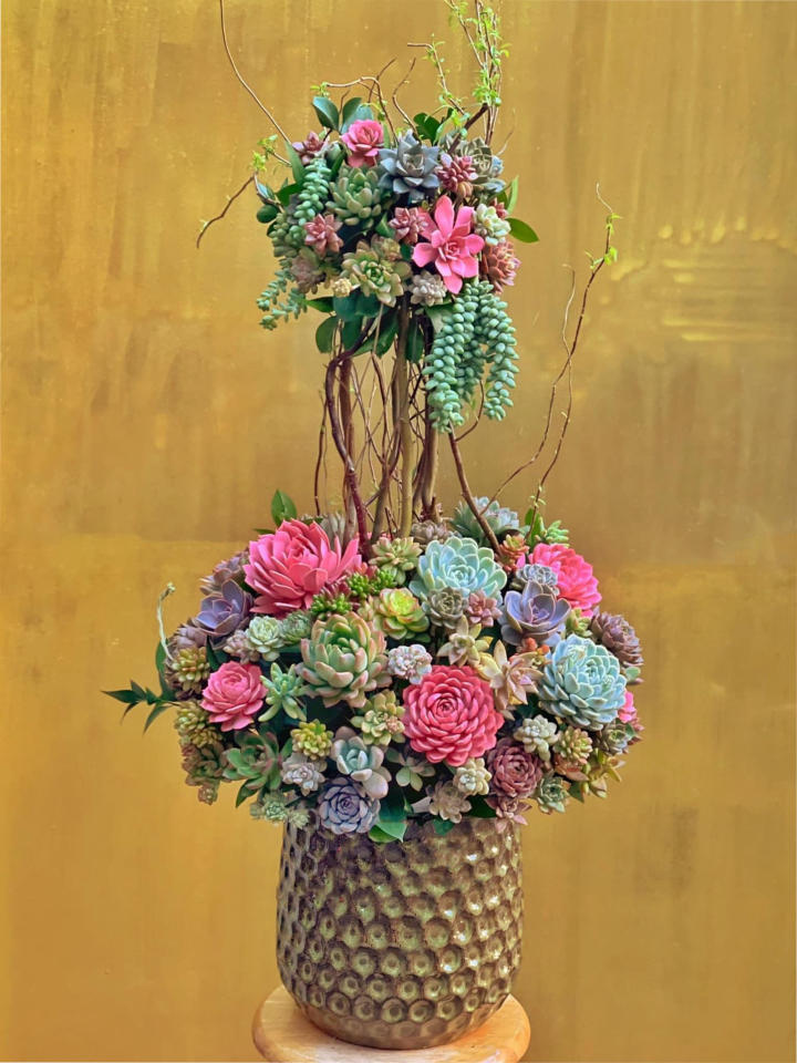 Sen đá được phối nhiều loại: sen đá bông lớn dáng hoa hồng, sen đá mini, các cụm xanh bạc/xanh ngọc xen kẽ.