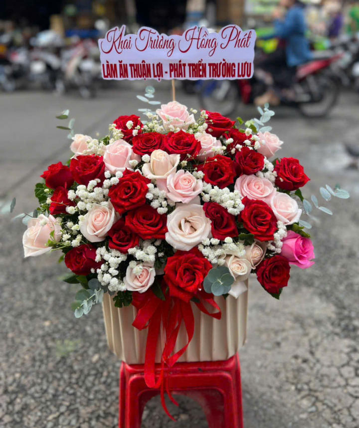 Giỏ hoa 8/3 trong ảnh mang phong cách trang trọng – rực rỡ – đầy ý nghĩa chúc mừng 🌸❤️