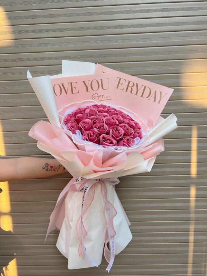 Bên ngoài bó hoa được bọc giấy hồng pastel và trắng, xếp lớp hài hòa, kết hợp voan trắng mềm tạo hiệu ứng bồng bềnh, tinh tế. Phần chân bó hoa được thắt nơ voan lớn cùng ruy băng hồng nhạt, làm tổng thể thêm nữ tính và sang trọng.
